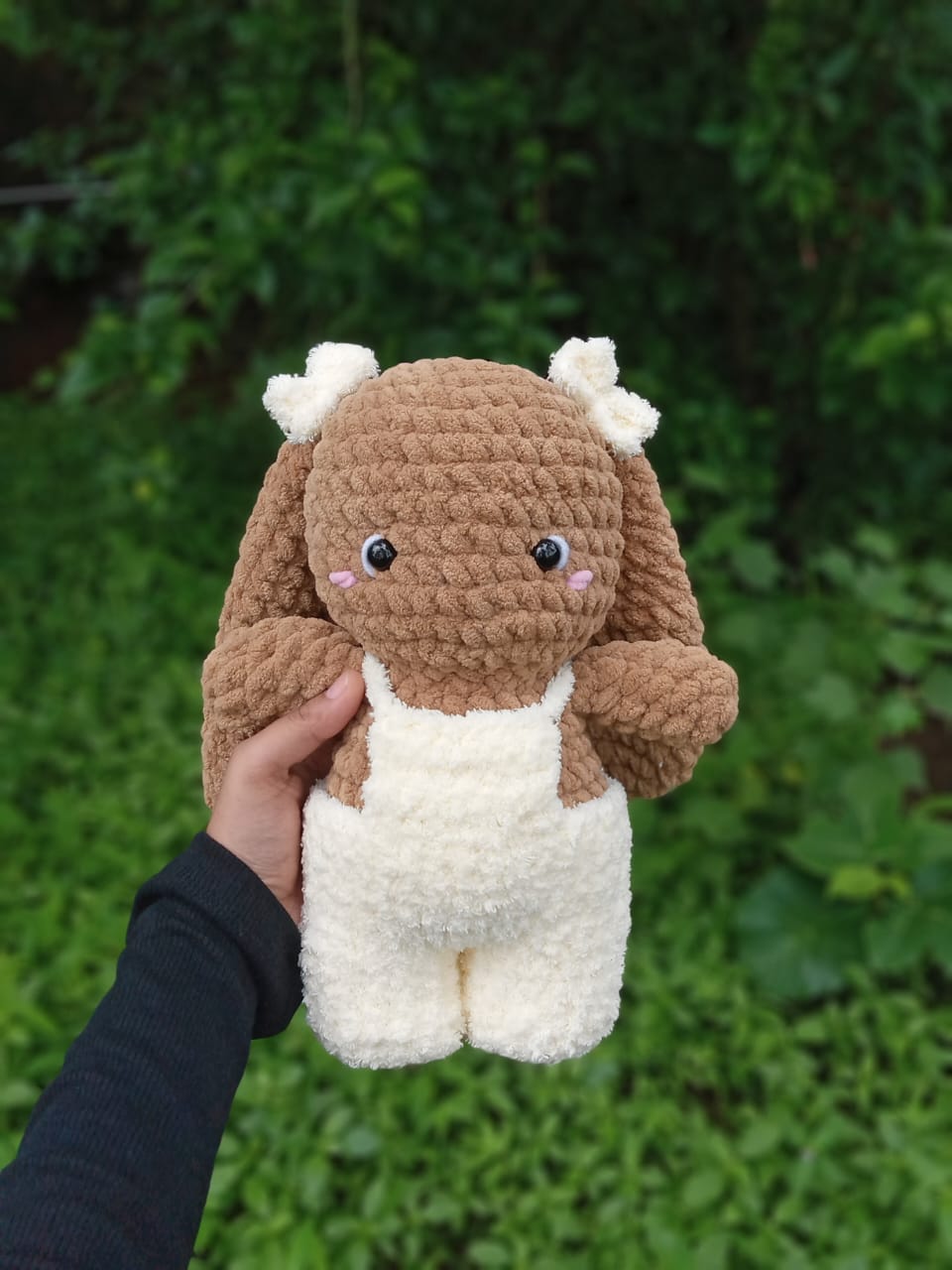 This premium 9-inch Brown Bunny with Fluffy Overalls is expertly crafted from high-quality chenille yarn and filled with soft fibrefill for optimal cuddling. The meticulous construction ensures durability while maintaining a gentle touch. Ideal for nursery décor, baby shower gifts, or as a cherished companion for collectors of all ages. Requires specific care: cold hand wash only with mild soap, no wringing, and flat drying in shade to preserve its exceptional quality and softness.